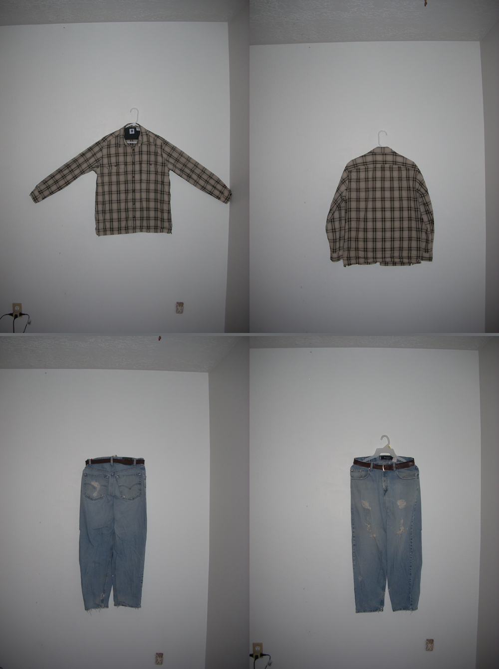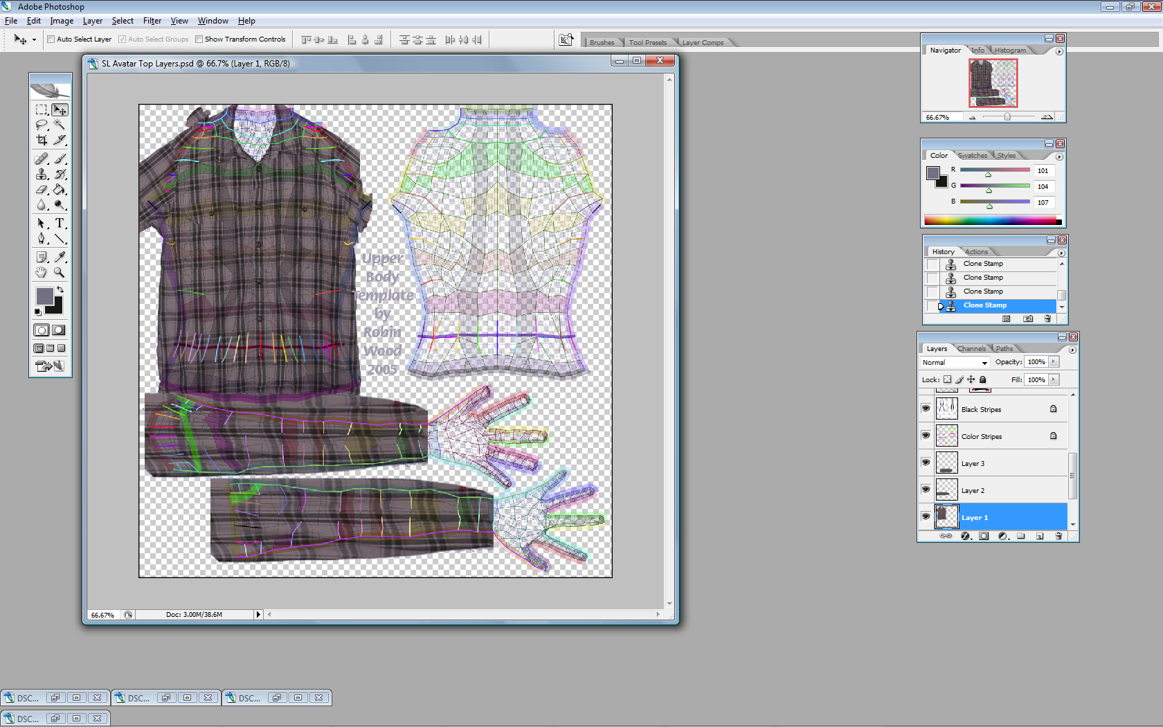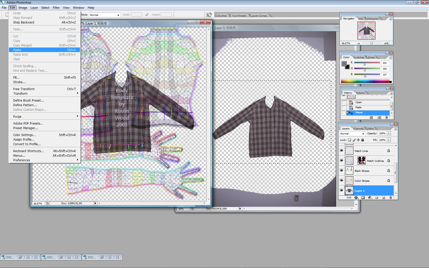 Second Life Tutorials How to create an outfit for second life using a digital camera, photoshop, and your own clothing. This Tutorial is a little more advanced, what we will be doing is using your own clothes, and turning them into second life clothing. This really isn't a whole lot different from just making a t shirt, but we will need a different template, there are many sites out there with advanced second life clothing templates, I prefer to use Robin Wood's templates which are available here. You can also download the free templates that second life provides from the second life website here. For this tutorial I will be using Adobe Photoshop CS2 and Robin Wood's upper and lower body template. A few more items you might need would be either a white or solid color wall to hang clothing against, or a big piece of white construction board. This is so that we can easily get rid of the background later. I also like to use a few thumbtacks to spread the clothing out on the wall or background. Ok the first thing that we are going to do is get our clothing setup on our background, and take pictures of whatever you want to make. In this case it will be a button up shirt and an old pair of jeans. I prefer to take 2 seperate pictures of the objects so that I can work with them both seperately. Here is what my setup looks like. Notice that I put a belt on the pants, this will add to the effect once it is on your avatar. You could also leave the shirt unbuttoned if you want, but I prefer to button them up. After you have all of your pictures, and make sure to take front and back as you can see, load the pictures and the upper body template in photoshop. I usually minimize the ones that I am not working on in order to avoid confusion, and keep the screen clear.