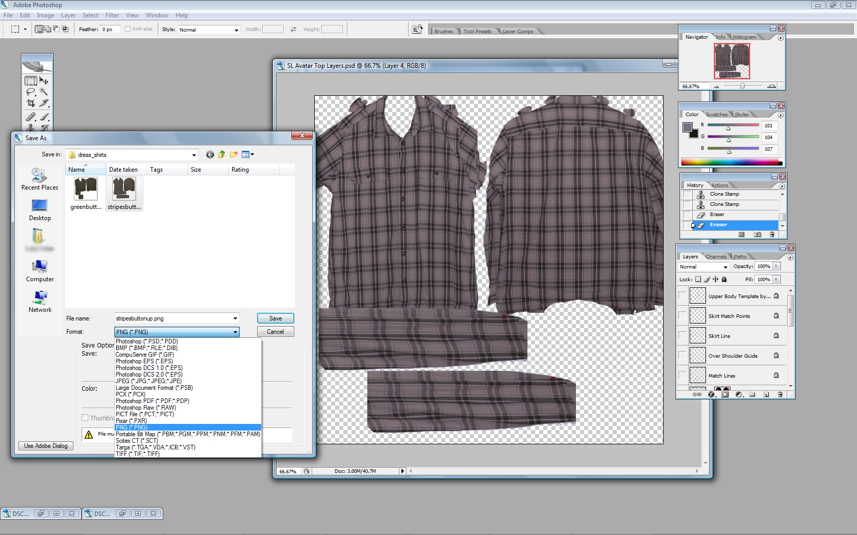 Ok now that you got the hang of stretching images and using the clone stamp tool it's time to do everything you just did except with back of the shirt. The back usually goes quicker. Once you have your image in place, you need to erase any part that is in the other template areas like the hands. Now we need to remove all the layers except for the shirt ones. Do this by selecting the "eye" image on the appropriate layers. After all the template layers are gone make sure you are ready to save the file. Make sure to save it as a .png file.